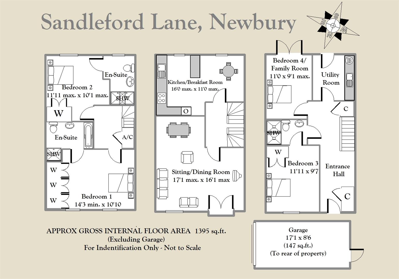 A well-presented four bedroom town house built by David Wilson Homes in 2005 and located in a popular area of South Newbury, within the catchment area of Park House school. The property benefits from uPVC double glazing, gas central heating, a low-maintenance south facing rear garden, garage and off road parking. The spacious accommodation is arranged over three floors with the ground floor comprising entrance hall, double bedroom with a jack and jill en-suite shower room, fourth bedroom/family room and a utility room. On the first floor is the sitting/dining room with Juliette balcony overlooking the neighbouring Green and a kitchen/breakfast room with integrated appliances. On the top floor there is a spacious Master bedroom with ample fitted wardrobes and an en-suite bathroom, and a further double bedroom with fitted wardrobe and en-suite shower room. Externally, the property has off road parking and a garage to the rear of the house as well as an enclosed garden with large patio area, ideal for al-fresco dining. Sandleford Lane is conveniently located for Newbury Retail Park and Tesco superstore whilst also a short drive from the town centre and mainline railway station which offers regular direct links to London, Paddington taking less than an hour.