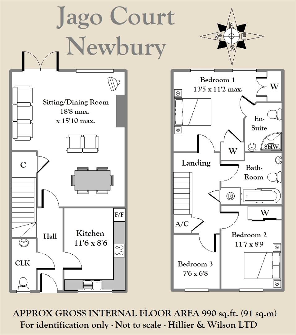 A three bedroom family home located in a popular area on the south side of Newbury. The property is ideal for investment or first time buyers and benefits from gas central heating, uPVC double glazing and off road parking. The ground floor comprises entrance hall, cloakroom, modern kitchen and sitting/dining room with French doors onto the garden. Upstairs, there is a master bedroom with en-suite shower room and built-in wardrobe, two further bedrooms (one of which has a built-in wardrobe) and a family bathroom. Externally, there is an attractive rear garden which is both stoned/paved with mature hedges and plants; whilst to the front, there is off road parking via driveway as well as a further allocated parking bay nearby. Jago Court is conveniently located just a short drive from Newbury town centre and mainline railway station which provides regular direct links to London, Paddington taking less than an hour. Newbury Retail Park is within walking distance and there are also excellent road links nearby including the A4, A339, A34 and and M4 motorway. NO ONWARD CHAIN
