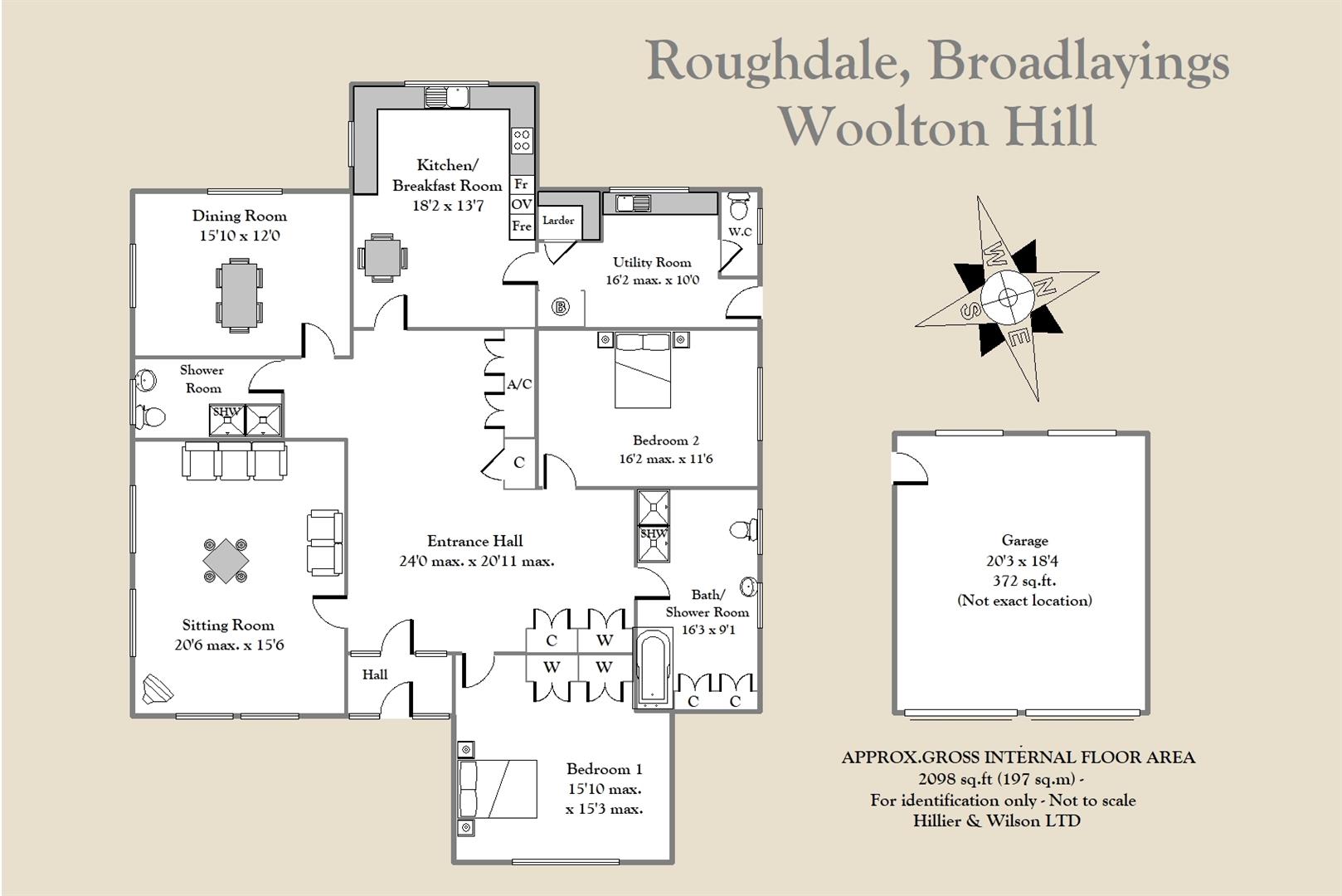 A substantial two/three bedroom detached bungalow with versatile accommodation, located in a sought after residential road in the popular village of Woolton Hill. The property has spacious living accommodation measuring 2098 sq.ft in size and also has a large loft with potential for converting (subject to the usual consents) whilst other benefits include oil fired central heating, wooden double glazing and detached double garage. The accommodation comprises porch, large entrance hall, two double bedrooms, dining room/bedroom, sitting room, kitchen/breakfast room, utility room with larder, W.C, shower room and bathroom with separate shower. Externally there is a low maintenance, west facing rear garden which is mainly lawn with tree/hedge borders and a patio area. To the front of the property, there is ample off road parking via driveway. Broadlayings is situated in a prestigious location within the popular village of Woolton Hill, a few miles south of Newbury. Woolton Hill has good amenities including a church, village hall, sports club, post office, nursery, infants and junior schools and a pub. NO ONWARD CHAIN